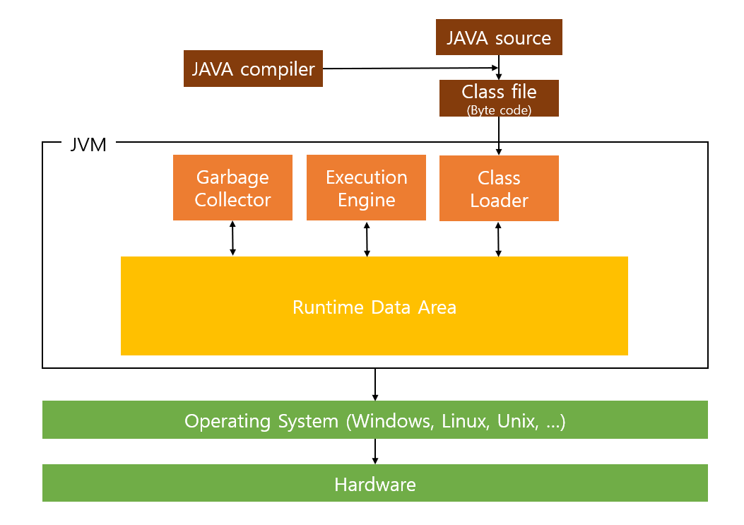 - 공통 실행환경(JVM)이 있어서 여러 기기에서 실행이 가능함(=여러 운영체제에서 실행가능)