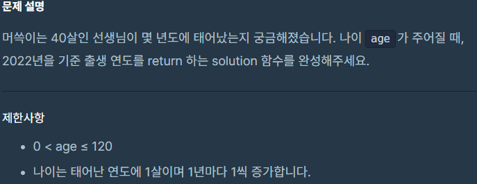 import java.time.*; class Solution { public int solution(int age) { LocalDate today = LocalDate.now(); return today.getYear() - age; // LocalDate 안쓸꺼면 // return 2022-age+1; } }⭐LocalDate는 로컬시간을 따른다.