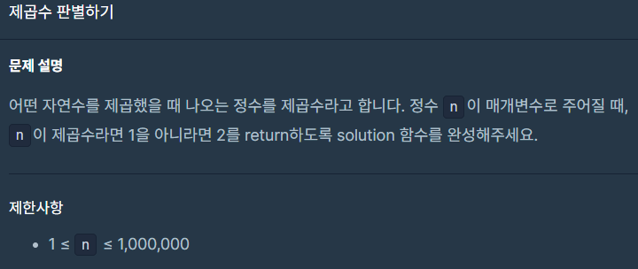 return Math.sqrt(n) % 1 == 0 ? 1 : 2;728x90'프로그래머스 > 자바(JAVA)' 카테고리의 다른 글