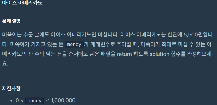 class Solution { public int[] solution(int money) { int[] answer = new int[2]; answer[0] = money / 5500; // 몫 = n잔 answer[1] = money % 5500; // 나머지 = 잔돈 return answer; } }6. 옷가게 할인 받기