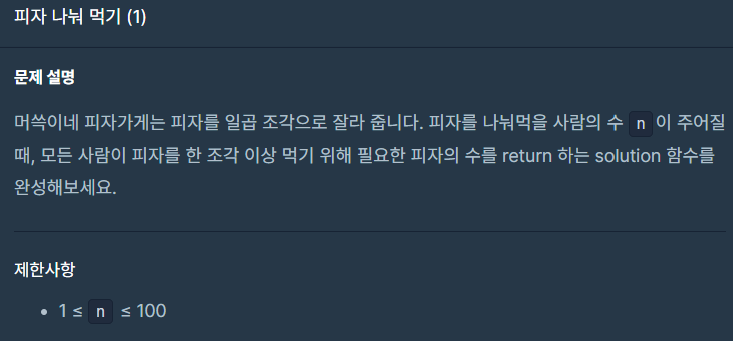 class Solution { public int solution(int n) { return (n % 7 == 0)? n / 7 : n / 7 + 1; } }3. 피자 나눠먹기 2