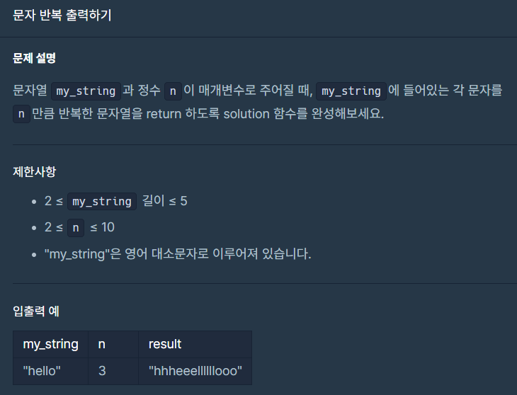 class Solution { public String solution(String my_string, int n) { String answer = ""; for(int i=0; i<my_string.length();i++){ for (int j=0; j<n; j++){ answer += my_string.charAt(i); } } return answer; } }✅ 1. 다른풀이