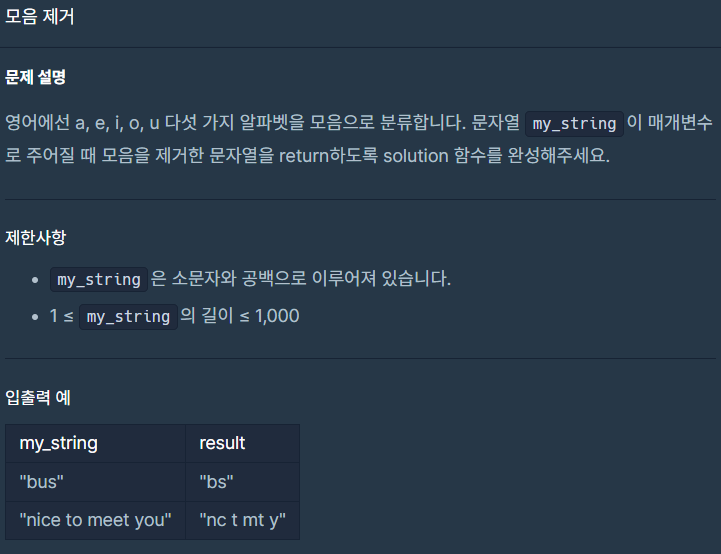 class Solution { public String solution(String my_string) { String answer = ""; answer = my_string.replaceAll("[aeiouAEIOU]", ""); return answer; } }📌 replaceAll() 메서드는 해당 정규 표현식에 매치되는 모든 문자를 두 번째 인자인 빈 문자열로 대체합니다.