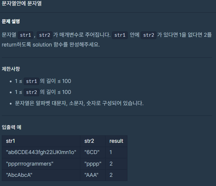 class Solution { public int solution(String str1, String str2) { int answer = str1.contains(str2)? 1: 2; return answer; } }📌 contains() 메서드는 문자열이 특정 부분 문자열을 포함하고 있는지를 확인하는 데 사용된다.