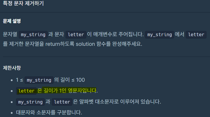 class Solution { public String solution(String my_string, String letter) { String answer = ""; answer = my_string.replace(letter, ""); return answer; } }📌 replace()