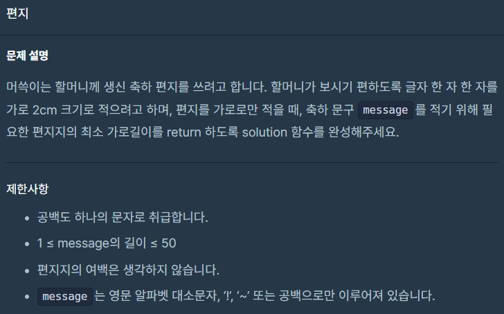 class Solution { public int solution(String message) { int answer = message.length() * 2; return answer; } }4. 모음 제거