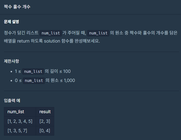 : 출력값이 [짝수, 홀수]로 나오기 때문에 굳이 변수를 선언하는게 아니라 if문에 맞춰서 answer[0], [1]값을 바로 카운팅하면 된다.✅ 2. 다른풀이