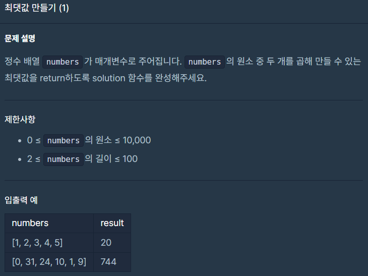 import java.util.Arrays; class Solution { public int solution(int[] numbers) { Arrays.sort(numbers); // 오름차순 정렬 후 return numbers[numbers.length-1] * numbers[numbers.length-2]; // 인덱스값으로 곱하기 } }📌 sort()