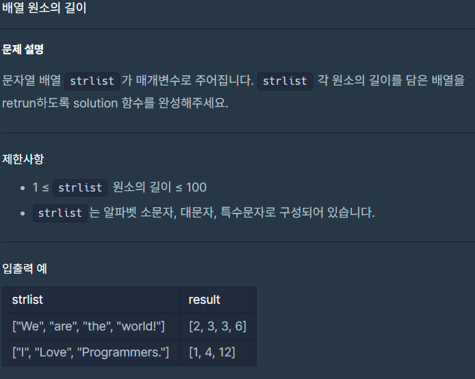 class Solution { public int[] solution(String[] strlist) { int[] answer = new int [strlist.length]; // 배열생성, 길이=stelist배열의 길이 for(int i=0; i<strlist.length; i++) { answer[i] = strlist[i].length(); } return answer; } }5. 배열 뒤집기