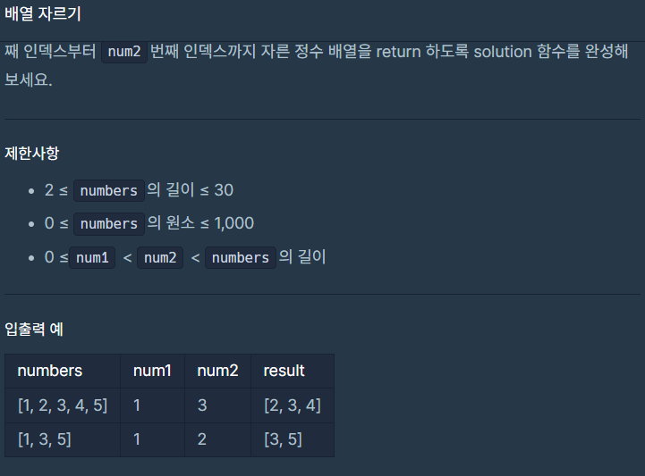 class Solution { public int[] solution(int[] numbers, int num1, int num2) { int[] answer = new int[num2 - num1 + 1]; for (int i = num1; i <= num2; i++) { answer[i -num1] = numbers[i]; } return answer; } }✅ 다른풀이(2)