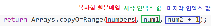 import java.util.*; class Solution { public int[] solution(int[] numbers, int num1, int num2) { return Arrays.copyOfRange(numbers, num1, num2 + 1); } }📌 copyOfRange()
