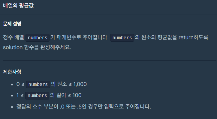 class Solution { public double solution(int[] numbers) { double answer = 0; int sum = 0; for(int i: numbers){ sum+=i; } answer = sum/(double)numbers.length; return answer; } }