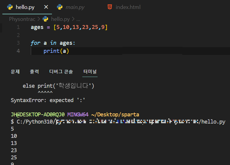 print("청소년입니다")◈ 반복문 (for~in~ : )