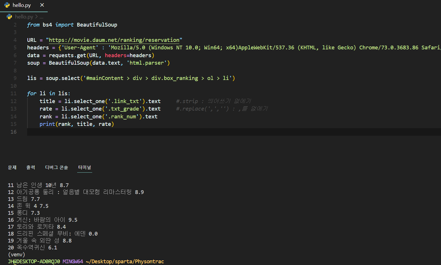 [3강 정리] 파이썬(Python) 반복문, venv 설정, 웹크롤링(bs4), select, select_one웹개발 종합반 2023. 8. 3. 23:35728x90더보기