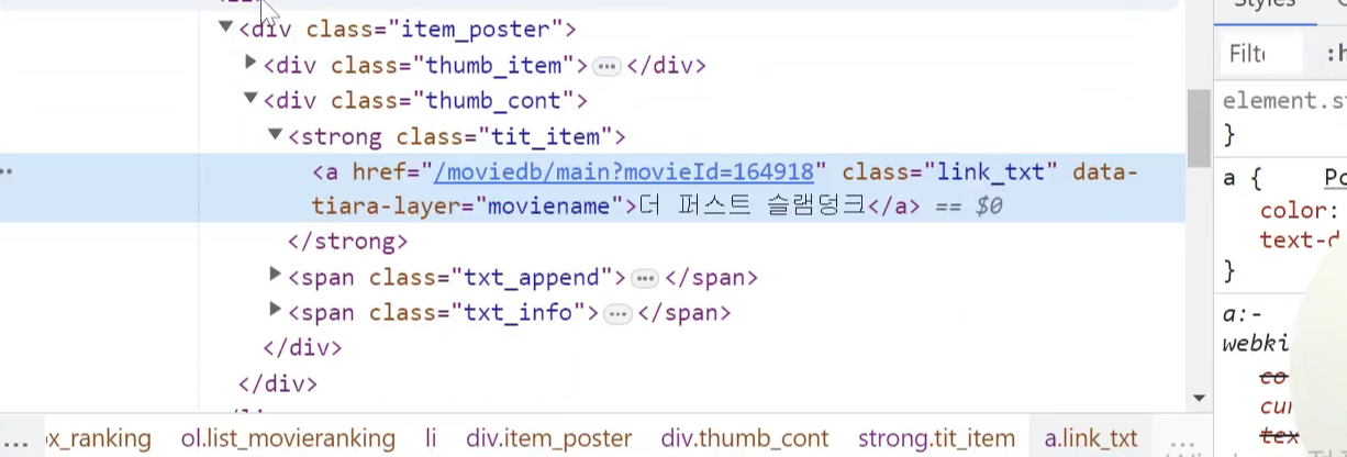 ③ 필요한 코드부분까지 편집 후 리스트로(soup.select) 준비하기