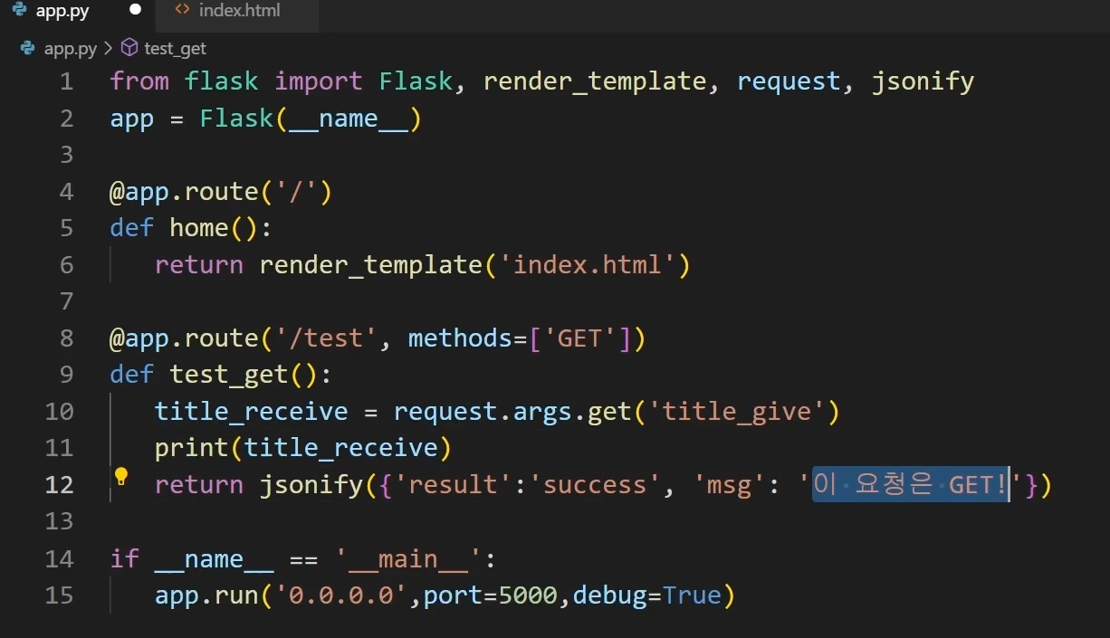 // app.py from flask import Flask, render_template, request, jsonify app = Flask(__name__) @app.route('/') def home(): return render_template('index.html') @app.route('/test', methods=['GET']) def test_get(): title_receive = request.args.get('title_give') print(title_receive) return jsonify({'result':'success', 'msg': '이 요청은 GET!'}) if __name__ == '__main__': app.run('0.0.0.0',port=5000,debug=True)