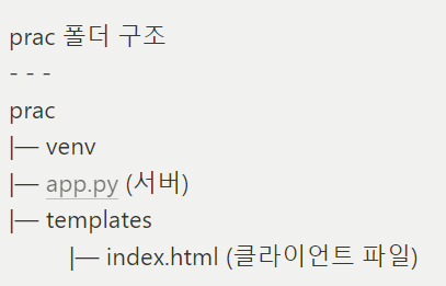 📌 Flask는 만들 프로젝트의 폴더 구조가 정해져 있기 때문에 꼭 규칙을 지켜서 만들자!🌟 통상적으로 flask 프레임워크를 쓸 때 가장 flask를 실행시길 가장 기본이 되는 python파일을 app.py라고 명명한다.