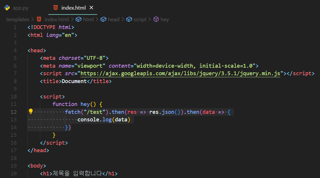 // index.html // GET요청 fatch코드 fetch("/test").then(res => res.json()).then(data => { console.log(data) })👉 API를 만들고 사용하는 과정에서는 Flask에 request와 jsonify라는 기능이 필요하다.