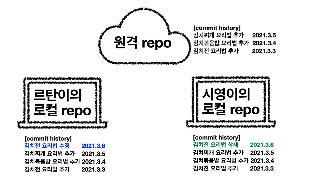 - ํ์ ํ ๋, ํน์ ์ฌ๋ฌ ์ปดํจํฐ๋ฅผ ์ฌ์ฉํ๋ค๋ฉด ํ๋์ ์๊ฒฉ repo ์ ์ฌ๋ฌ ๋ก์ปฌ repo ๋ฅผ ์ฐ๊ฒฐ์ํฌ ์ ์๋ค. ํ๋์ ํ๋ก์ ํธ๋ฅผ ๋์์ ์์ ํ๋๊ฒ ๊ฐ๋ฅํด์ง๋ค.