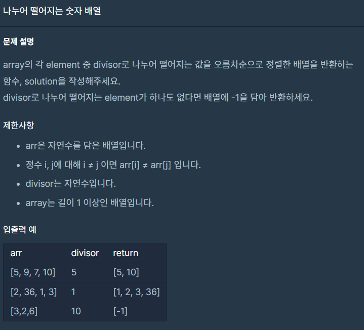 import java.util.Arrays; class Solution { public int[] solution(int[] arr, int divisor) { int[] answer = new int[arr.length]; int index = 0; // 새 배열의 인덱스값 확인하기 for(int i : arr){ if(i % divisor == 0) { answer[index] = i; index++; } } if(index == 0) { return new int[] {-1}; }else { answer = Arrays.copyOf(answer, index); // 초기화된 값 잘라내기 Arrays.sort(answer); return answer; } } }처음에는 주어진 배열인 int[]에 임의로 길이를 설정한 후 index변수를 부여하여 잘라내는 방식으로 진행했다.