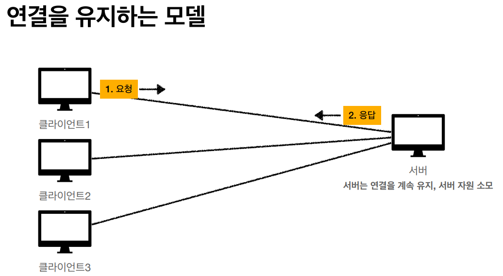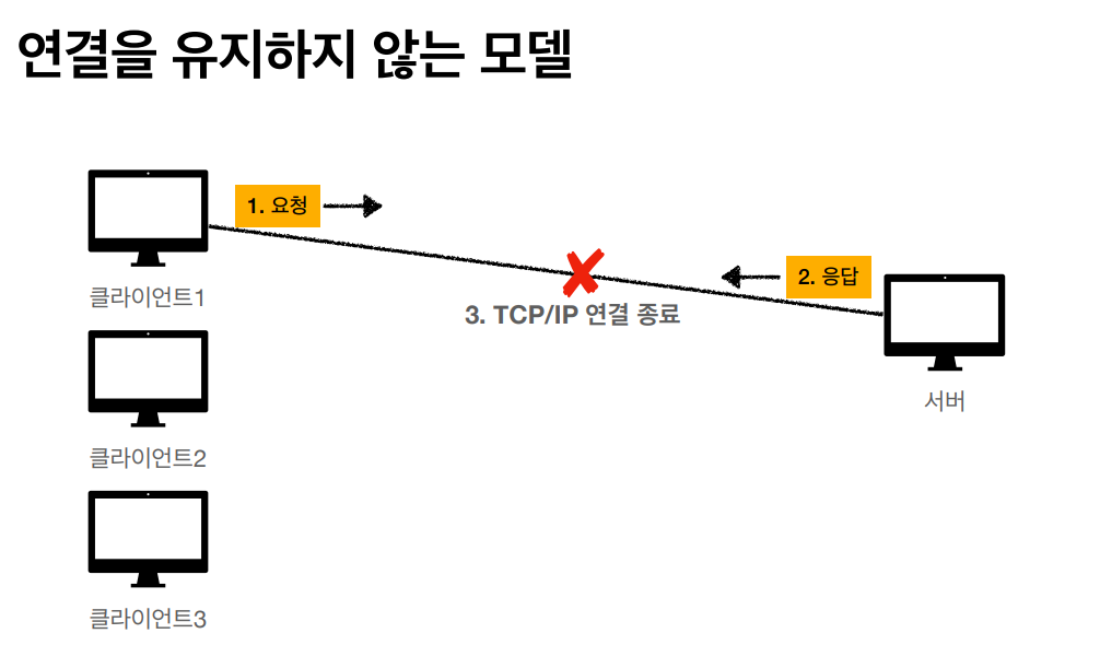 • HTTP๋ ๊ธฐ๋ณธ์ด ์ฐ๊ฒฐ์ ์ ์งํ์ง ์๋ ๋ชจ๋ธ