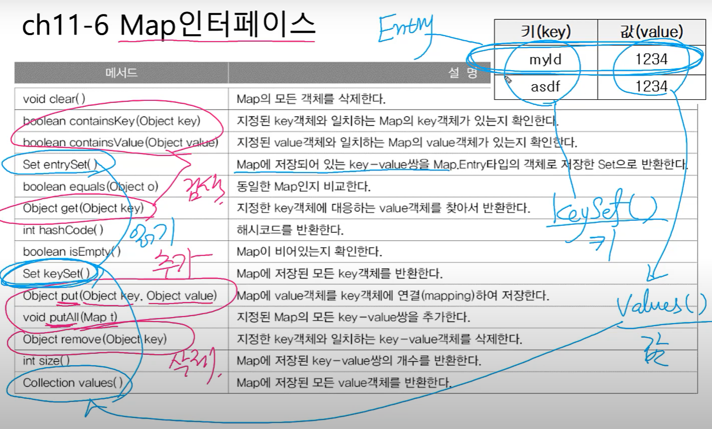 - Hashtable과 HashMap은 같은데 Hashtable이 옛날버전이다. 동기화에서 차이가 있음(13장 쓰레드에서 설명)