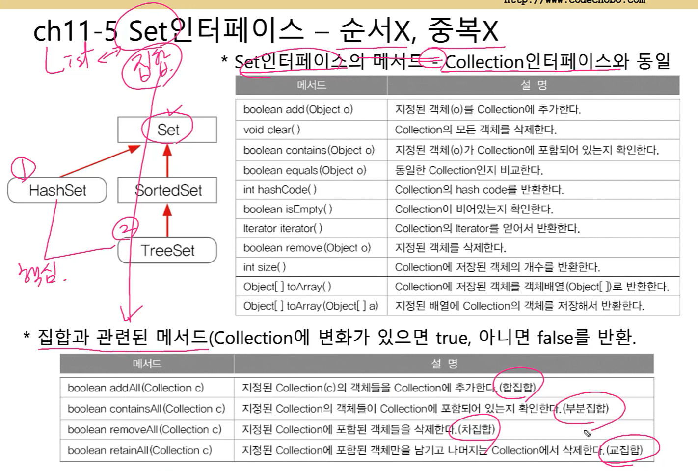 (Map인터페이스는 두가지와는 전혀 다른 형태로 컬렉션을 다루기 때문에 상속계층도에 포함되지 못했다)