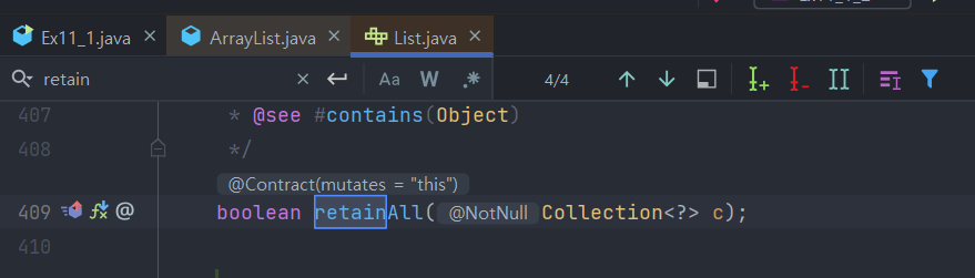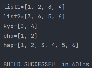 import java.util.*; class Exercise11_1 { public static void main(String[] args) { ArrayList list1 = new ArrayList(); ArrayList list2 = new ArrayList(); ArrayList kyo = new ArrayList(); // 교집합 ArrayList cha = new ArrayList(); // 차집합 ArrayList hap = new ArrayList(); // 합집합 list1.add(1); list1.add(2); list1.add(3); list1.add(4); list2.add(3); list2.add(4); list2.add(5); list2.add(6); /* (1) . 알맞은 코드를 넣어 완성하시오 */ System.out.println("list1="+list1); System.out.println("list2="+list2); System.out.println("kyo="+kyo); System.out.println("cha="+cha); System.out.println("hap="+hap); } }ArrayList에서는 따로 정의하지 않았기 때문에 혹시나 싶어서 ArrayList에서 정의된 집합메서드가 있는지 확인해 봤으나