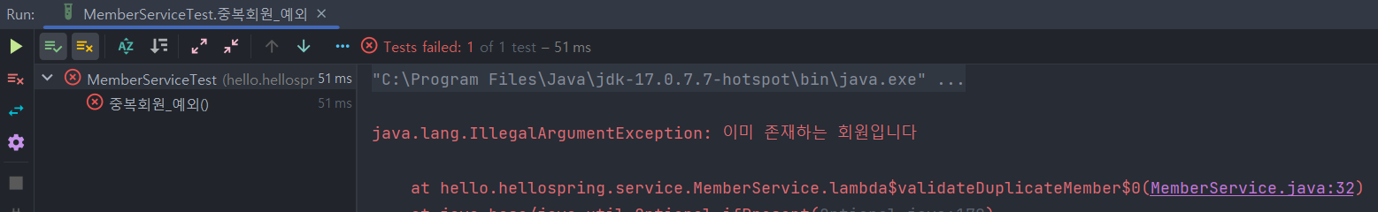 public Long join(Member member){ // 조건1: 같은 이름이 있는 중복회원은 안된다 validateDuplicateMember(member); memberRepository.save(member); return member.getId(); } private void validateDuplicateMember(Member member) { memberRepository.findByName(member.getName()) .ifPresent(m -> { throw new IllegalArgumentException("이미 존재하는 회원입니다"); }); }회원가입 시에 이미 있는 name이라면 예외처리로 구현되는 코드를 작성했고 테스트 실패로 나왔다.