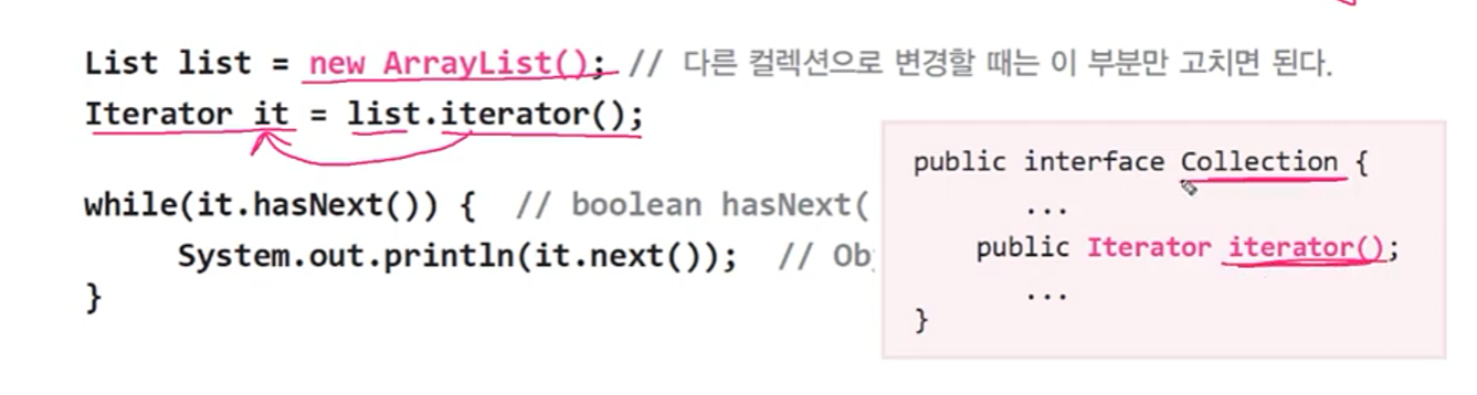 컬렉션(List, Set, Map)은 구조가 달라서 읽어오는 방법이 전부 다름. 구조에 상관없이 읽어올 수 있는 방법이다.(표준화)