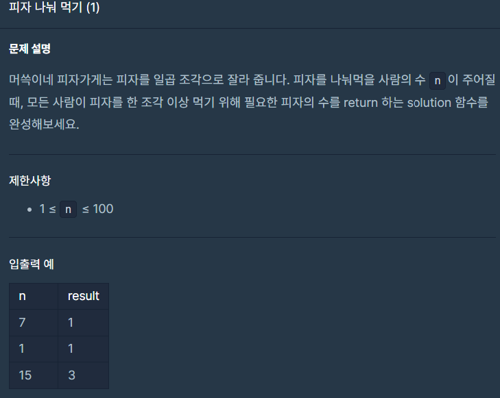 하지만 8조각을 먹으려면 무조건 2판을 사야하기 때문에 나머지가 발생할 경우 무조건 올림처리를 진행하면 된다고 생각했다.