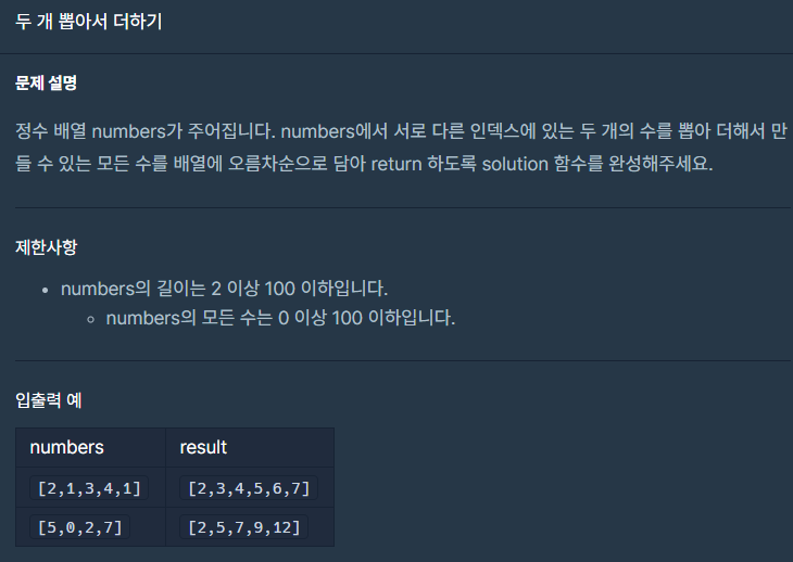 import java.util.HashSet; import java.util.Set; import java.util.Collections; import java.util.List; import java.util.ArrayList; class Solution { public int[] solution(int[] numbers) { Set<Integer> answer = new HashSet<>(); for(int i = 0; i < numbers.length; i++) { for(int j = i + 1; j < numbers.length; j++) { answer.add(numbers[i] + numbers[j]); } } List<Integer> sortedList = new ArrayList<>(answer); Collections.sort(sortedList); int[] result = new int[sortedList.size()]; for(int i = 0; i < sortedList.size(); i++) { result[i] = sortedList.get(i); } return result; } }다른풀이에서 TreeSet을 사용하면 정렬까지 바로 된다고 해서 다시 리팩토링을 해봤다.